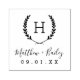 Create a monogrammed wedding stamp to personalize favors, welcome bags or stationery. Personalize the template with the bride and groom's names or monogram initials. Add your wedding date, the city, state or venue name or any other custom text. This modern rustic logo-style design has a laurel branch frame with your monogram initial. Use the design tools to add more text or edit the fonts and layout.