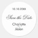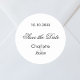A Save the Date sticker for your wedding. A stylish white background, black text. Personalise and add your names and wedding date.
