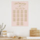 Elegant gold calligraphy script wedding seating chart poster design features a monogram of the bride and groom names and wedding date and custom template text for fourteen table numbers and guest names. Colours include blush pink and champagne gold.