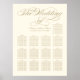 Elegant calligraphy script wedding seating chart poster design features a monogram of the bride and groom names and wedding date and custom template text for table numbers and guest names. Champagne gold and soft white / light ivory printed colours.