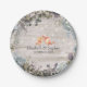 Modern Wedding Shower Paper Plate Templates - Elegant Script, Vintage Watercolor Botanical Floral and String Lights on Rustic Wood Background.