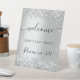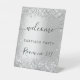 A welcome sign for a party. A stylish faux silver looking background decorated with faux glitter sparkles. Personalise and add your name and room number/text. Black letters.