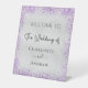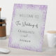 A faux silver looking background, decorated with purple faux glitter sparkles. With the text: Welcome to The Wedding of. Personalise and add your names.
