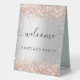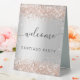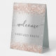 A welcome sign for a party. A stylish faux silver looking background decorated with rose gold confetti. Personalise and add your name. Black letters.