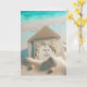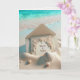An intricately designed card with a floral border rests on the sand alongside seashells, with a vivid turquoise sea in the background