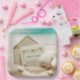 An intricately designed card with a floral border rests on the sand alongside seashells, with a vivid turquoise sea in the background.