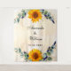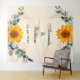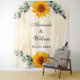 A golden watercolored background. Decorated with green watercolored eucalyptus leaves, sprigs, greenery, sunflowers and a faux gold leaves. Personalise and add the names of the bride and groom, and the date. Can be used as a welcome banner, as party wall decoration or as a photo booth backdrop.