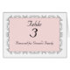 Lovely wedding reception table number card done in white and pink. A delicate silver scroll frame surrounds the pink text area. Text is fully customisable in font style, colours, and sizes.