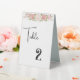 This wedding table number card is shown in the plastic tent style with a modern layout with a lovely rose floral accent.
