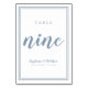 This design was created for smaller intimate wedding celebrations. Simple, minimalist and elegant Wedding Table Number NINE design features a contemporary design with a double frame border in Dusty Blue on a crisp white background. The chic design provides timeless yet modern sophistication. Personalise wedding table design with your wedding details in trendy blue lettering and script. The back of the card is a duplicate of the front. Order one for every table with the individual table numbers.