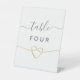 Elegant, simple, minimal white wedding table number tabletop sign with faux gold rope heart and modern calligraphy script.