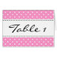 Wedding table number cards with elegant pink polka dot design. Customisable background colour to match your wedding theme. Handy note cards to help guest find their table place. View our shop for more elegant wedding table setting designs.