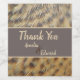 These wedding wine bottle labels feature an animal print photo of female duck feathers. The beautiful gold and dark brown spotted feathers curve and flow vertically on this simple to use bottle label. A solid tan and grey banner in the centre provides the background for the bride and groom's names and the words "thank you". All text can quickly be personalised.
