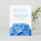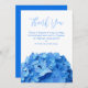 Big blue hydrangea flower thank you message cards. Choose the printed version, the download, or both as needed. White paper with blue text. Customise with a message to wedding, or shower guests.
