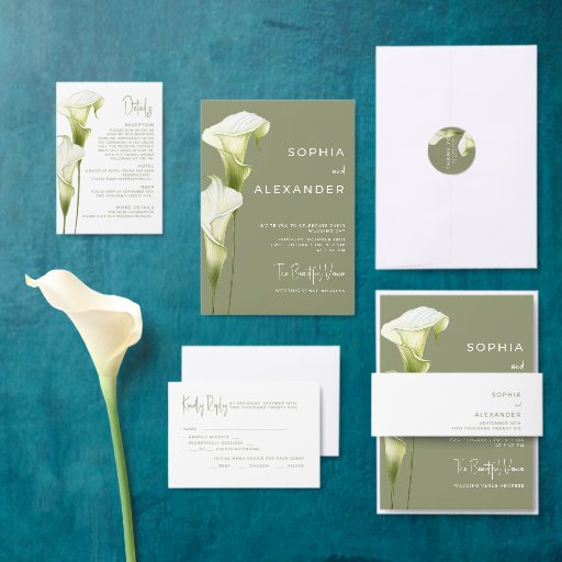 This wedding Thank You Cards features a sophisticated, minimalist style. Delicate calla lilies in soft green hues are depicted against a light background, creating an atmosphere of sophistication and tranquility. The design is modern, airy, and perfect for a stylish, romantic wedding.