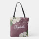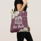 Wedding Brides Tote Bag Templates - Elegant Script, Mason Jars, Hydrangea Flowers and String Lights on Burgundy Red Floral Linen Background.