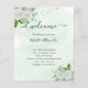 A watercolored green background, decorated with white florals, eucalyptus greenery, and faux silver glitter dust. Personalise and add your names and your wedding day timeline.