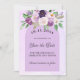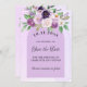 A modern and elegant Save the Date for a wedding. Watercolored violet, lavender background, and an arch frame. Decorated with violet and purple flowers. Personalise and add a date and names. The text: Save the Date is written with a large trendy hand lettered style script.