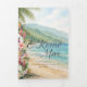 This elegant tri-fold wedding invitation features a hand-painted watercolor illustration of Maui, designed as a keepsake guide for a destination wedding weekend. Soft coastal blues, cool green landscapes, and watercolor details create a refined, storybook aesthetic that feels timeless and elevated.