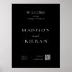 This elegant wedding welcome poster sign features a minimalist design with clean lines and a modern aesthetic. The text is centred and framed with a thin black border, providing a polished and sophisticated look. The poster warmly greets guests to the wedding ceremony and highlights the couple's names in bold, stylish fonts, creating a striking focal point. At the bottom, the sign includes the wedding date and location in a small, refined font. Additionally, there is a QR code on the bottom right, inviting guests to scan and view the wedding program digitally, adding a contemporary touch to the classic design. The overall layout is sleek, simple, and effective, perfect for a modern wedding.