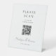 This elegant wedding welcome poster sign features a minimalist design with clean lines and a modern aesthetic. The text is centred and framed with a thin black border, providing a polished and sophisticated look. The poster warmly greets guests to the wedding ceremony and highlights the couple's names in bold, stylish fonts, creating a striking focal point. At the bottom, the sign includes the wedding date and location in a small, refined font. Additionally, there is a QR code on the bottom right, inviting guests to scan and view the wedding program digitally, adding a contemporary touch to the classic design. The overall layout is sleek, simple, and effective, perfect for a modern wedding.