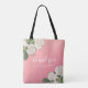 Wedding Favour Welcome and Thank You Gift Bags Templates - Elegant White lovely Watercolor Hydrangea Flowers and String Lights on Pink Gradient Background.