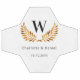 A white background. Decorated with a classic faux gold laurel wreath. Personalise and add your family name's initial, names and a date. Black text.