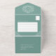 Muted sage green hand-drawn growing leaf botanical art add your own couples photo inside wedding all-in-one invitation. Personalise this detachable reply wedding invitation with your own wedding ceremony details, photo, monogram initials, and meal options on your detachable reply cards. Simple green leaf design and monogram initials circle of leaves. Other colours and matching wedding items available. © Original leaf drawing and design by Sarah Trett for www.mylittleedenweddings.com on Zazzle.