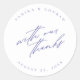Elegant handwritten script text 'with our thanks' in a simple yet striking, favor sticker shown here that also features your names and wedding date in periwinkle on white. Search ID954 to see other products and color choices for this wedding suite.