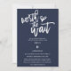 For when circumstances mean that sadly it is necessary for you to reschedule the your wedding day, this is a convenient way to let your guests know your change of plans and new date as soon as possible. This typographical design has a modern white set script at the top Worth the Wait with a heart motif. The rest of the text in white, you can easily personalise, with a navy blue background on the front and white on the back. Text and background colours on both sides can be changed if you wish via Customise Further option.