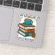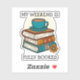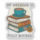 Whimsical sticker design for book lovers and bookworms. An illustration of a cosy pile of books with a coffee cup balanced on the top. The colours are blues, reds and oranges. Above and below the image are the words 'My Weekend Is Fully booked' in black text. These are templates for you to add your own words if you wish to change them.