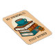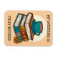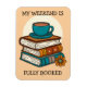 Whimsical magnet design for book lovers and bookworms. An illustration of a cosy pile of books with a coffee cup balanced on the top. The colours are blues, reds and oranges. Above and below the image are the words 'My Weekend Is Fully booked' in black text. These are templates for you to add your own words if you wish to change them.