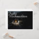 Die Karte zeigt eine stimmungsvolle, winterliche Szenerie mit einer kleinen, beleuchteten Holzhütte inmitten eines verschneiten Waldes. Die warme Lichtquelle im Inneren schafft einen schönen Kontrast zur dunklen, friedlichen Umgebung. Der elegante „Merry Christmas“-Schriftzug in Weiß verleiht dem Motiv eine festliche Note. 🎄✨