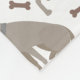 Cute Weimaraner dogs sit, stand and rollover with scattered dog bones and pawprints on a white background.