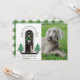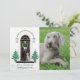 Featuring a sweet Weimaraner wearing a pink bow tie! A classic front porch decorated for the holidays, featuring Christmas trees with stars flanking the elegant black door, a pine wreath with pink gingham bow, and lanterns topped with roses and holly. In the style of Magnolia | modern farmhouse | classic elegant. 3 COLORS OF PLAID FOR THE BACK ARE IN THE DESIGN (dark green as shown, black, or pink - just edit and hide the plaid images that you don't want). Add your own family portrait for a personal holiday greeting!