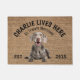 Weimaraner Personalised Dog lover welcome doormat. This welcome mat can be personalised with your dog’s name, the slogan can also be changed or you could use a picture of your own dog (make sure it's transparent).  Text reads: Charlie lives here…. All treats welcome