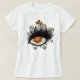 Weird eye shirt with a digital illustration of a female eye with broken iris made of lava and long eyelashes ending in bizarre flowers with angled petals in a cloudy grey sky.