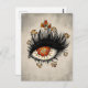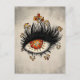 Weird eye postcard with a digital illustration of a female eye with broken iris made of lava and long eyelashes ending in bizarre flowers with angled petals in a cloudy gray sky.
