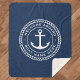 Sherpa blanket featuring a white, elegant anchor and rope emblem with customizable text "welcome aboard" and your boat name on a dark blue background.