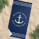 Beach towel featuring a white nautical anchor and customisable text "welcome aboard" and your boat name. White design on dark blue background.