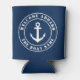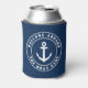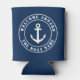 Welcome aboard custom boat name nautical anchor Can Cooler. Custom beverage holder with round logo. Elegant accessories for beach home, yacht, lake house, cruise cabin, bedroom, sailing boat, pontoon, beach party etc. Personalised Birthday gift ideas for friends, family, sailor, skipper, fisher, boat captain, dad, husband, grandpa, father, mum and others. Customisable colours. Also great for wedding party. Navy blue and white design with anchor icons. Double sided print.