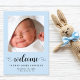 A simple and cute pastel blue baby boy birth announcement. The front features his photo, name, arrival date and birth stats, and "welcome" written in a stylish script with a heart swashes. On the reverse side of the card, add an additional photo, parent and sibling names, and a thank you or other message.