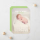 Add your newborn's photo to this simple, sweet, birth announcement with "Welcome 'Baby's name'" on the front. Green background on the back with a place to add new baby's stats and parent's names. Designed by Simply Put by Robin