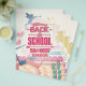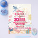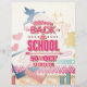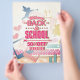Welcome Back to School 50% Off Promotional sales flyer with a white typography. A modern white background with a colourful collage under pink typography. The cute collage includes a blue cherub, picture shapes that are colourful and fun patterns in blue, and pink. Other graphics include cut-out shapes of birds and speech bubbles, colourful ribbons, lace and check pattern bottom trim, and also two pink hearts.