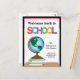 This back to school postcard features a graphic of a globe sitting on top of a stack of books. Multicolored text reads: Welcome back to SCHOOL. Customisable text allows you to add the teacher's name and school.