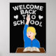Welcome back to school poster. Smiling Schoolgirl Shows Victory Gesture. Over black background