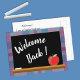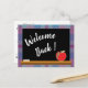 A simple , but efficient postcard to welcome your students back-to-school this year . The front has a black chalkboard with a little white chalk and a red apple . The background is a blue and purple plaid pattern . On the back is the text with all the info needed for the first day of school . Customise it using the template . There is also a space for the teacher name and room number .