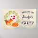 A welcome birthday poster with a grunge-y cream coloured background with trendy faint geometric shapes. Layered over top is a cartoon drawing of a cute orange fox sleeping peacefully. A green leaves wreath with 3 little red hearts behind.