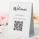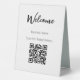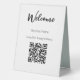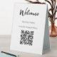 Welcome your customers with this black and white tabletop sign. There's a display image at the bottom. You must enter your website URL before ordering to show your custom QR code. The display text can be edited to show your desired text. (Shown: Welcome Business Name Scan for Today's Menu.) The sign is white. The text is black.