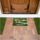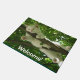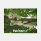 A white kitten lying on a tree branch amidst lush green foliage. The kitten's fur is pure white, contrasting with its pink nose and paw pads. Its eyes are a striking yellow. The kitten is positioned on a sturdy, brown tree branch, with leaves surrounding it, creating a natural frame. The word "Welcome" is written in bold, white letters at the bottom of the image. The lighting is soft and natural, highlighting the kitten's features and the vibrant green of the leaves. The composition is balanced, with the kitten as the central focus, surrounded by the natural elements of the tree.